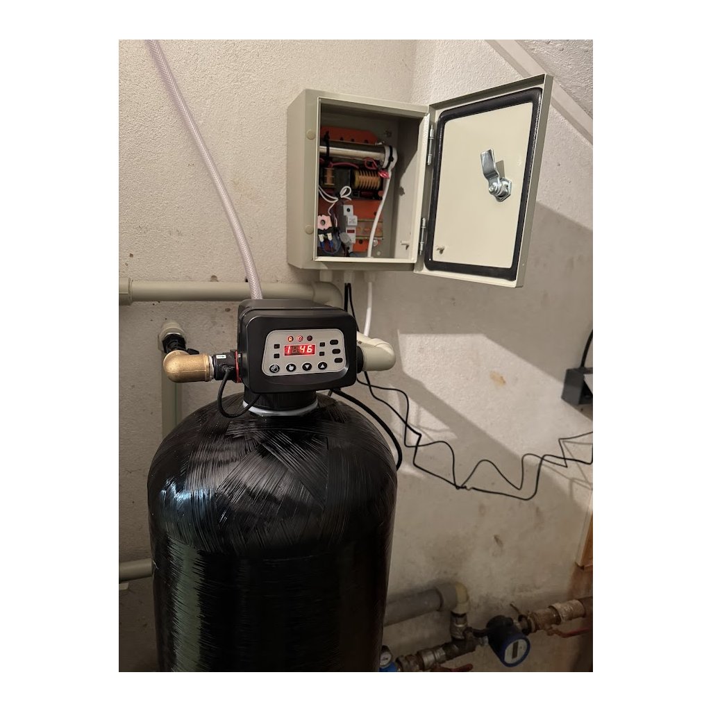 Typ řídící jednotky: digitální, objemová (ukazuje kolik zbývá litrů do regenerace, v kolik hodin bude regenerace, momentální průtok a kolik je hodin.