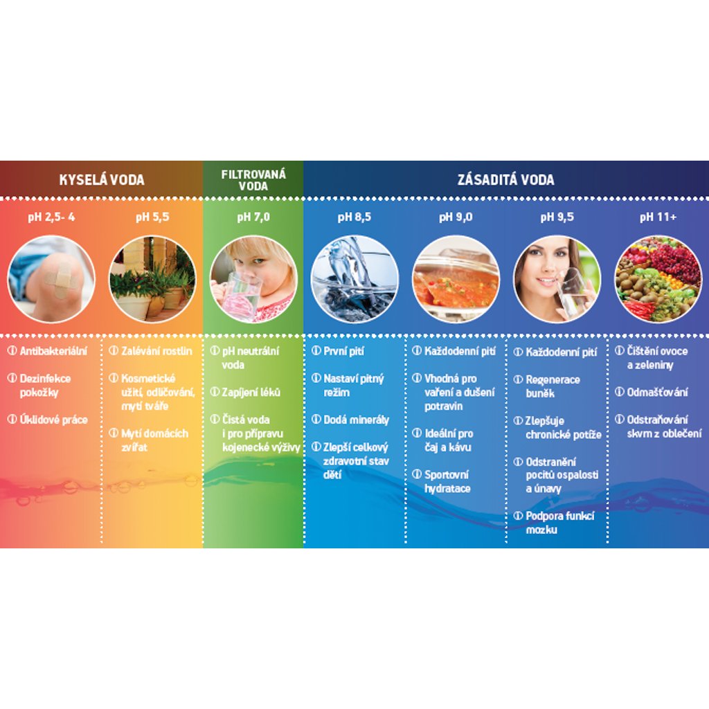 - Barevná stupnice rozsahy pH: 0, 1, 2, 3, 4, 5, 6, 7, 8, 9, 10, 11, 12, 13, 14.