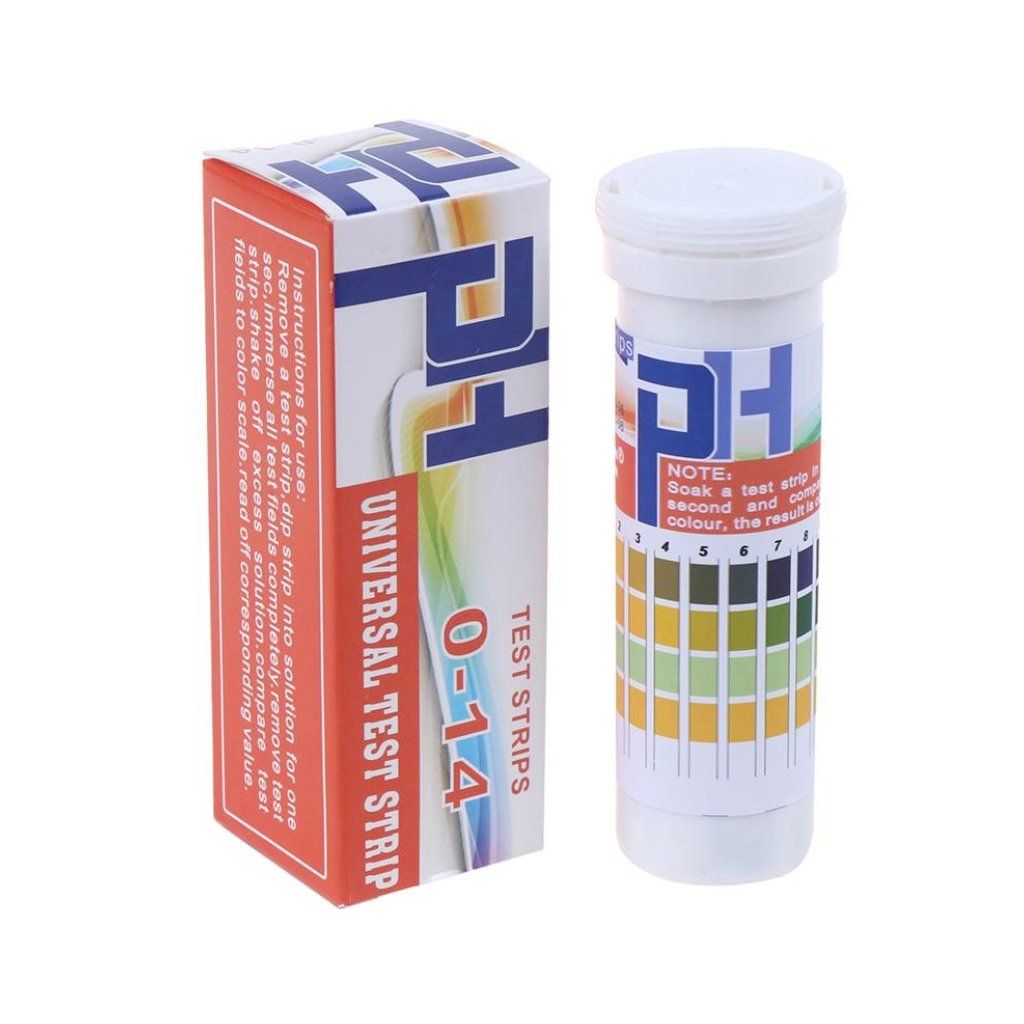 Každá krabička obsahuje 150 plastových testovacích proužků pro měření pH.