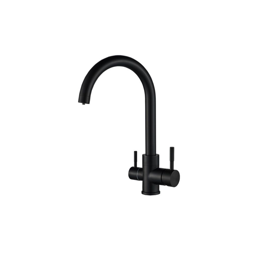 Trojcestná dřezová kuchyňská vodovodní baterie s moderním designem, keramickou kartuší a dvojitým vyústěním, prostředním pro upravenou vodu a okolo středu pro užitkovou teplou a studenou vodu. Menší páčka je na upravenou vodu, otáčí se o 90°.