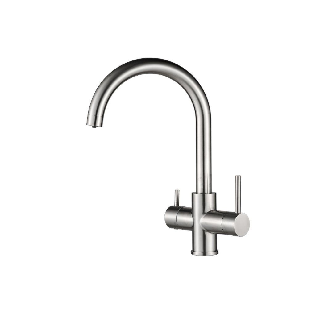 Trojcestná dřezová kuchyňská vodovodní baterie s moderním designem, keramickou kartuší a dvojitým vyústěním, prostředním pro upravenou vodu a okolo středu pro užitkovou teplou a studenou vodu. Menší páčka je na upravenou vodu.