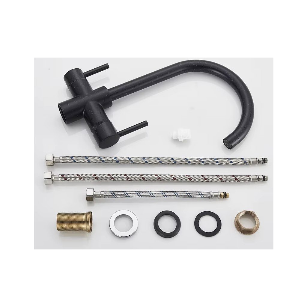 V balení je 3x hadička na připojení včetně těsnění - 1x hadička teplá + 1x studená voda s převlečnou maticí 3/8", 1x fitinka na upravenou vodu pro hadičku 1/4" (6,3 mm), 1x těsnění pod baterii, 1x těsnění pod kuchyňskou desku s podložkou, 1x šroubení s matkou na utažení ke kuchyňské desce.