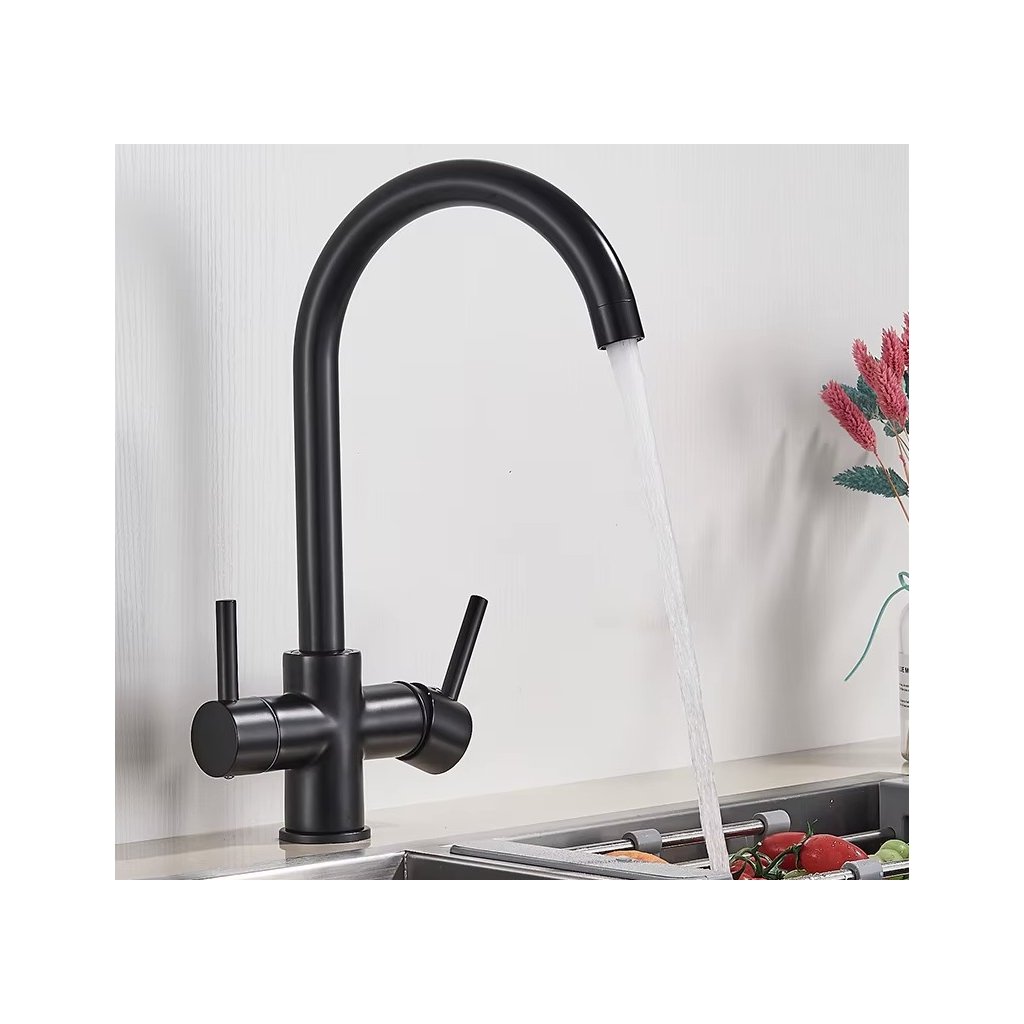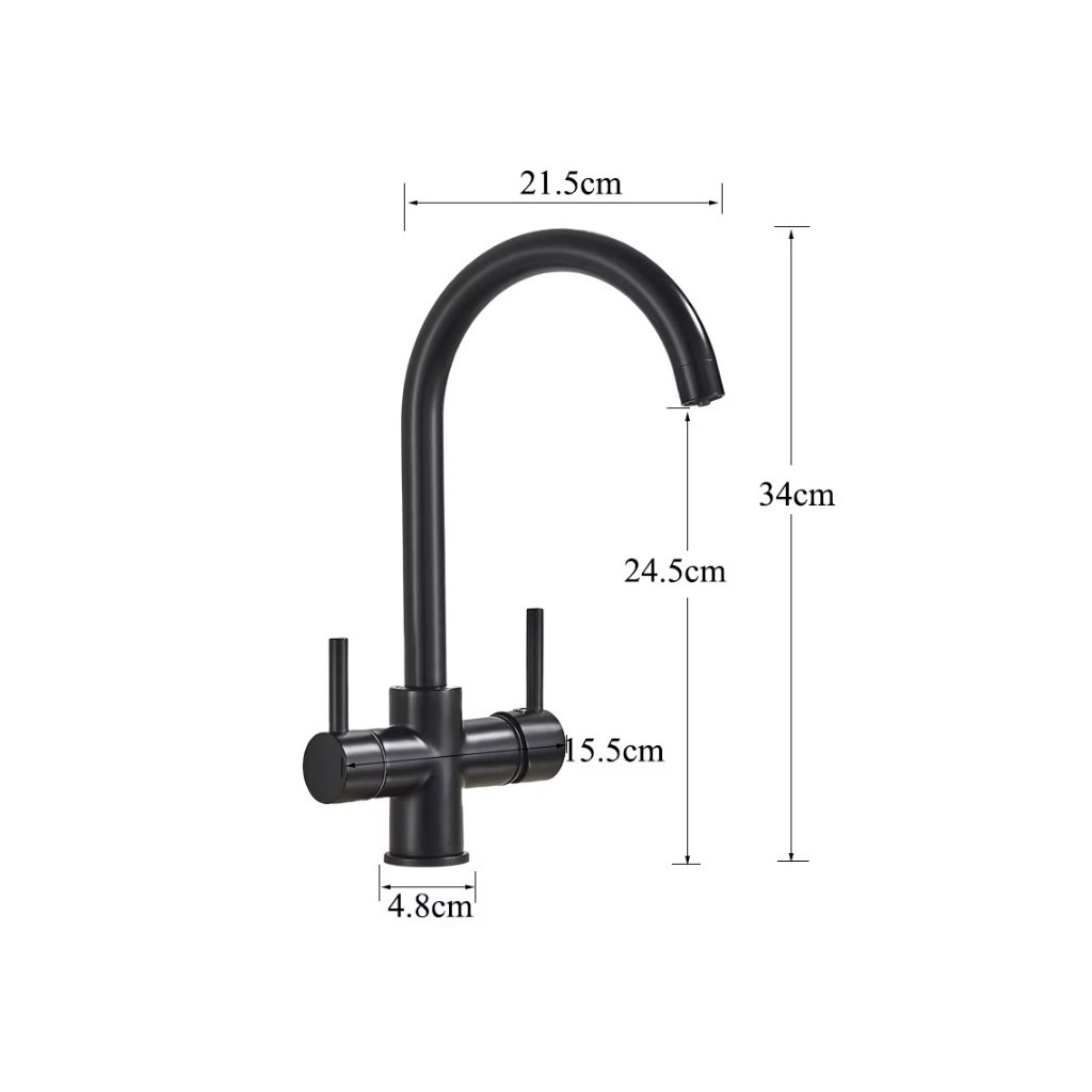 Trojcestná dřezová kuchyňská vodovodní baterie s moderním designem, keramickou kartuší a dvojitým vyústěním vedle sebe. Menší páčka je na upravenou vodu.