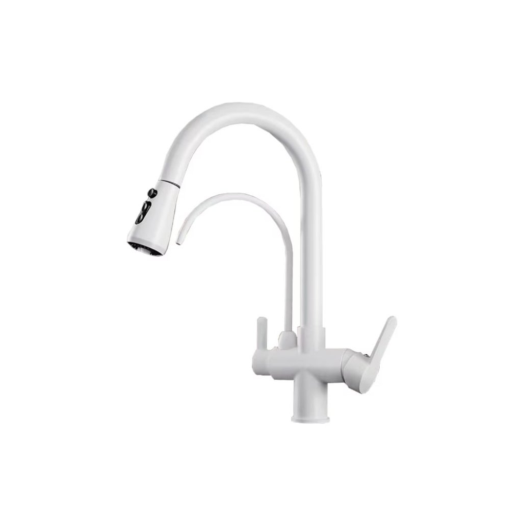 Trojcestná dřezová kuchyňská vodovodní baterie v moderním designu s keramickou kartuší a dvojím vyústěním, teplá a studená voda na hlavním otočném rameni o 360°, s vytahovací sprškou s přepínačem na sprchu a stop tlačítkem kde zastavíte zcela vodu, dále na malém otočném raménku je výstup pro filtrovanou vodu (či jinou vodu), ovládání je menší páčkou. Filtrace není součástí baterie, teplá a studená voda se dá používat i bez zapojení filtrace, výstup na filtrovanou vodu má zcela samostatný okruh.