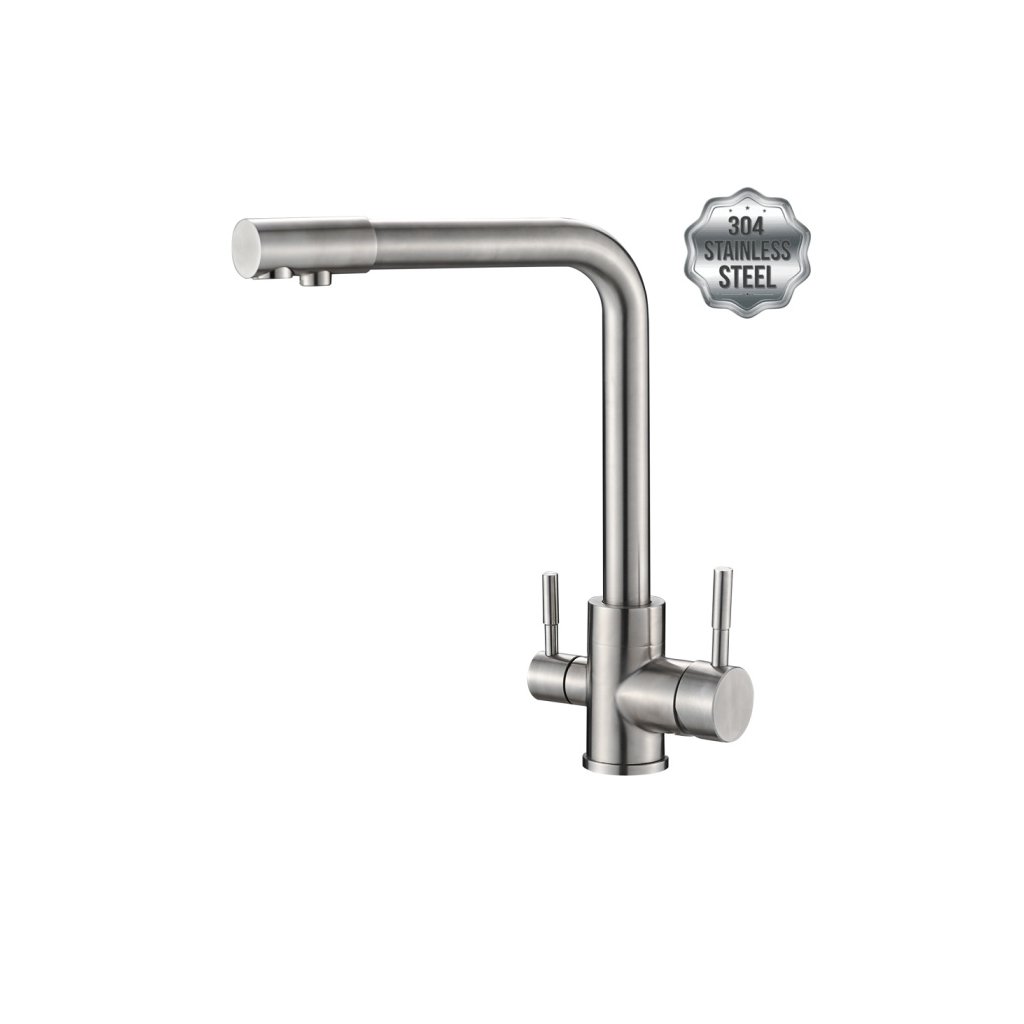 Trojcestná dřezová kuchyňská (lze použít i jako umyvadlová) vodovodní baterie s moderním designem, keramickou kartuší a dvojitým vyustěním, jedním pro upravenou vodu a druhým pro užitkovou teplou a studenou vodu. Menší páčka je na upravenou vodu.