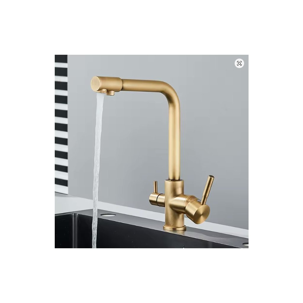 Trojcestná dřezová kuchyňská (lze použít i jako umyvadlová) vodovodní baterie s moderním designem, keramickou kartuší a dvojitým vyustěním, jedním pro upravenou vodu a druhým pro užitkovou teplou a studenou vodu. Menší páčka je na upravenou vodu.
